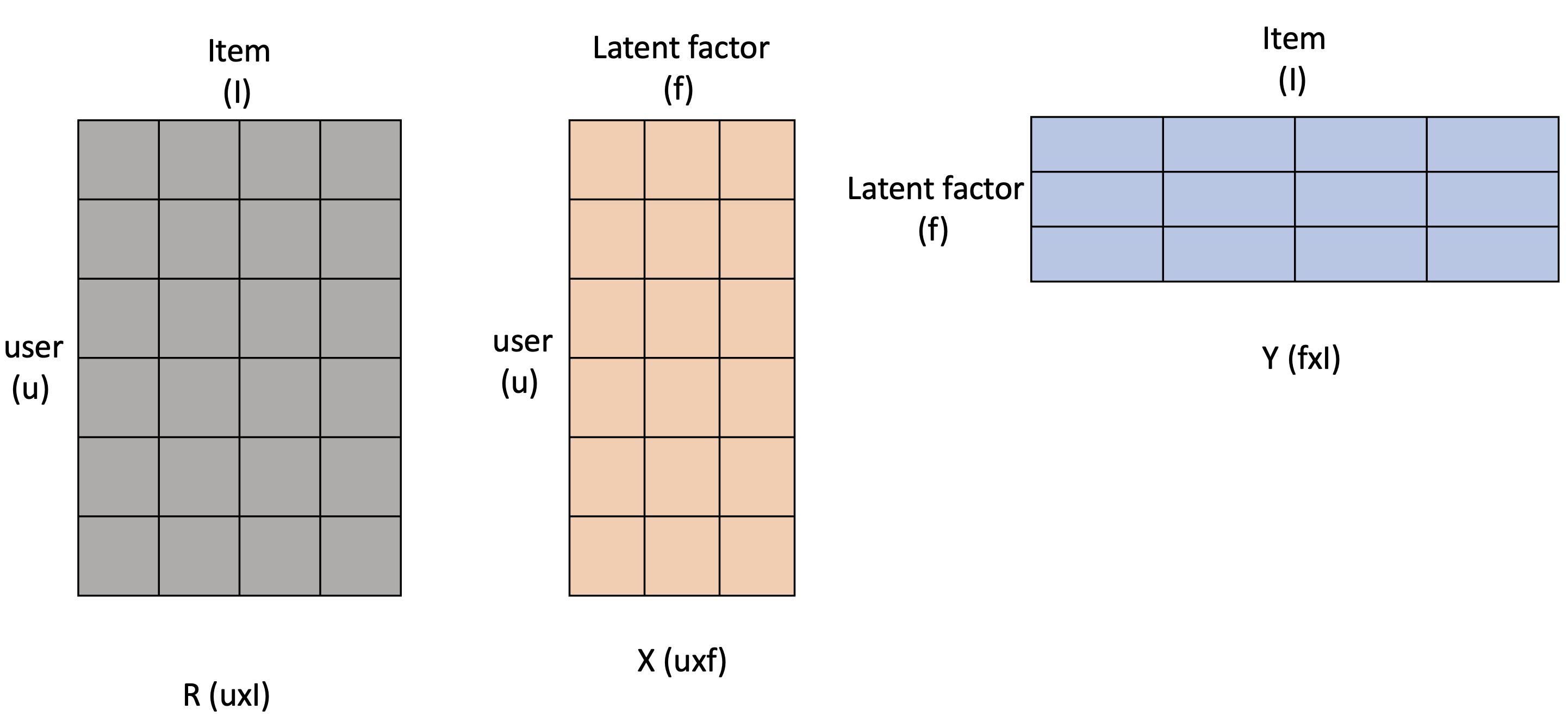 사용자-아이템 행렬을 Rating Matrix라고 부르며, 보통 R로 표현합니다. shape는 User의 수 * Item의 수 입니다. X는 User의 latent factor matrix (shape: U * f), Y는 Item의 latent factor matrix (shape: f * I) 입니다.