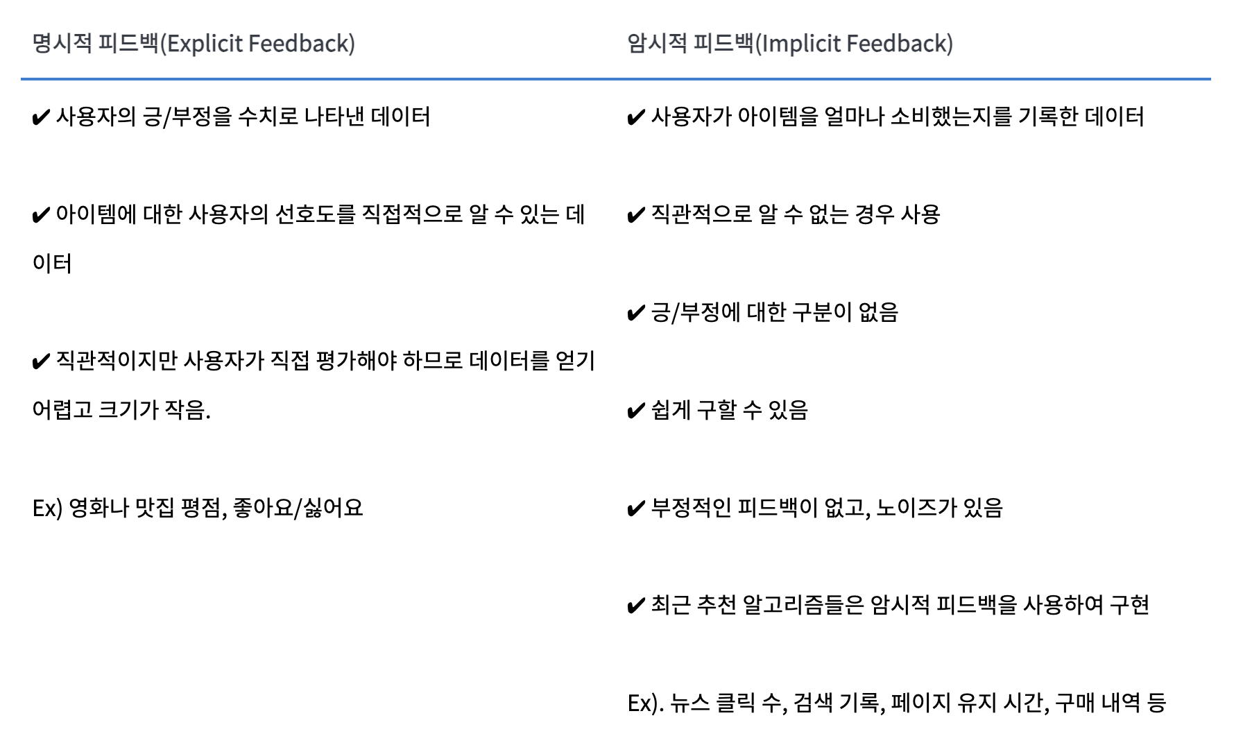 모델을 학습시키는 데이터는 Explicit Feedback, Implicit Feedback으로 나눌 수 있습니다. 각 데이터의 특징은 다음과 같습니다.