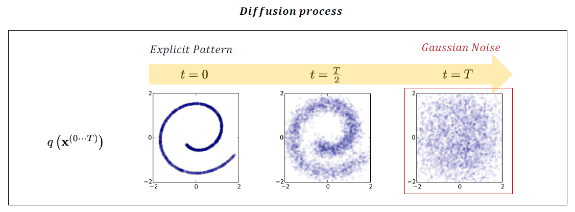 특정한 데이터의 패턴이 서서히 반복적인 과정을 거쳐 와해되는 과정(농도가 균일해지는)을 ‘Diffusion process’라 명명