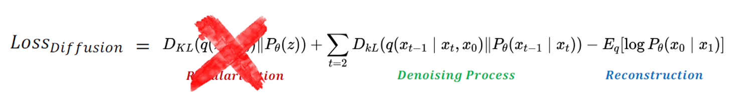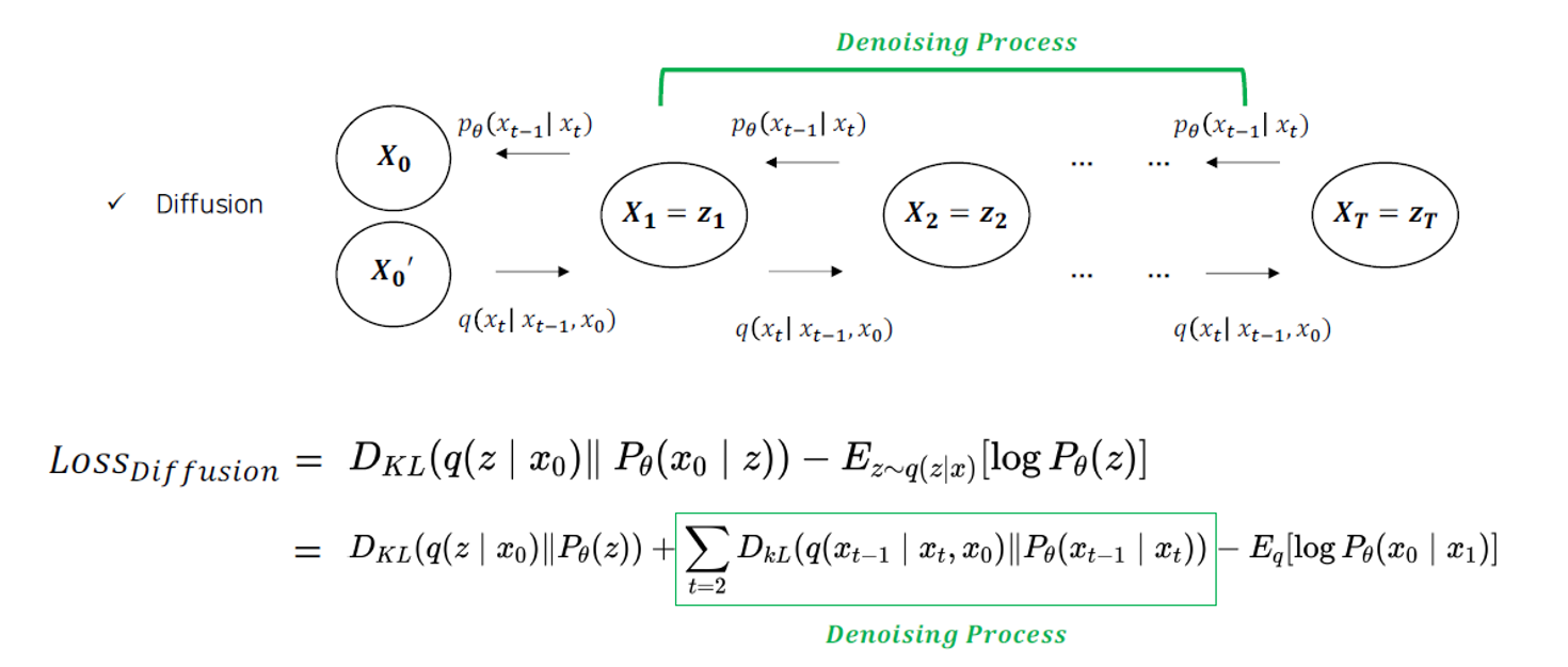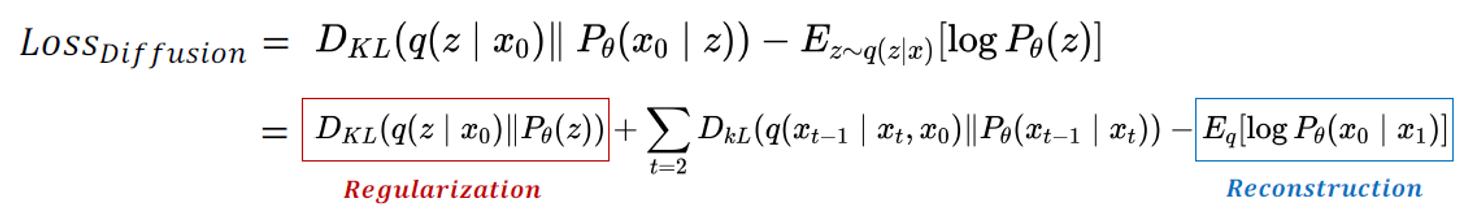 \(\begin{aligned} \operatorname{Loss}_{\text {diffusion}} & :=D_{K L}\left(q\left(z \mid x_0\right) \| P_\theta(z)\right)+\sum_{t=2} D_{k L}\left(q\left(x_{t-1} \mid x_t, x_0\right) \| P_\theta\left(x_{t-1} \mid x_t\right)\right)-E_q\left[\log P_\theta\left(x_0 \mid x_1\right)\right] \\ & :=\text {Negative log likelihood }\left(=\mathbb{E}_{x_T \sim q\left(x_T \mid x_0\right)}\left[-\log p_\theta\left(x_0\right)\right]\right) \end{aligned}\)