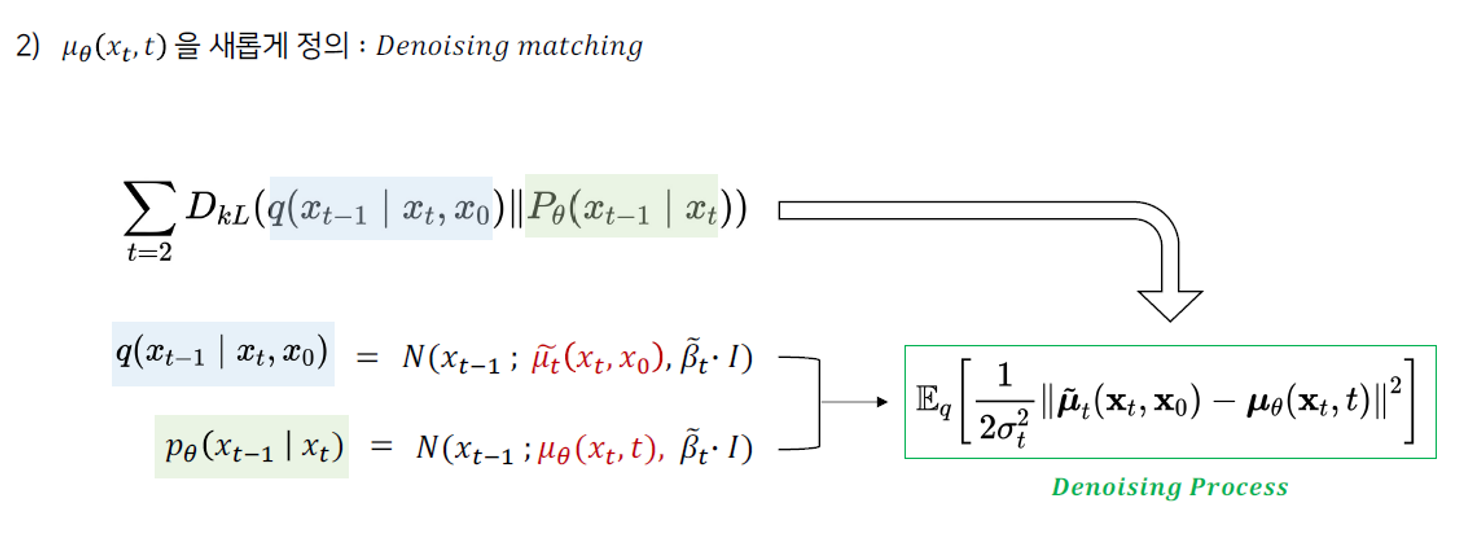 Denoising Process에서 KL Divergence가 이용되고 있다. P라는 reverse process는 q라는 reverse process를 최대한 approximate할 수 있도록 학습하는 것이 보여진다.