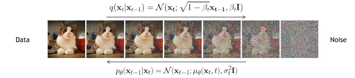 - data에 임의의 noise를 더해주는 forward process와 noise를 제거하는 reverse process를 학습하는 모델