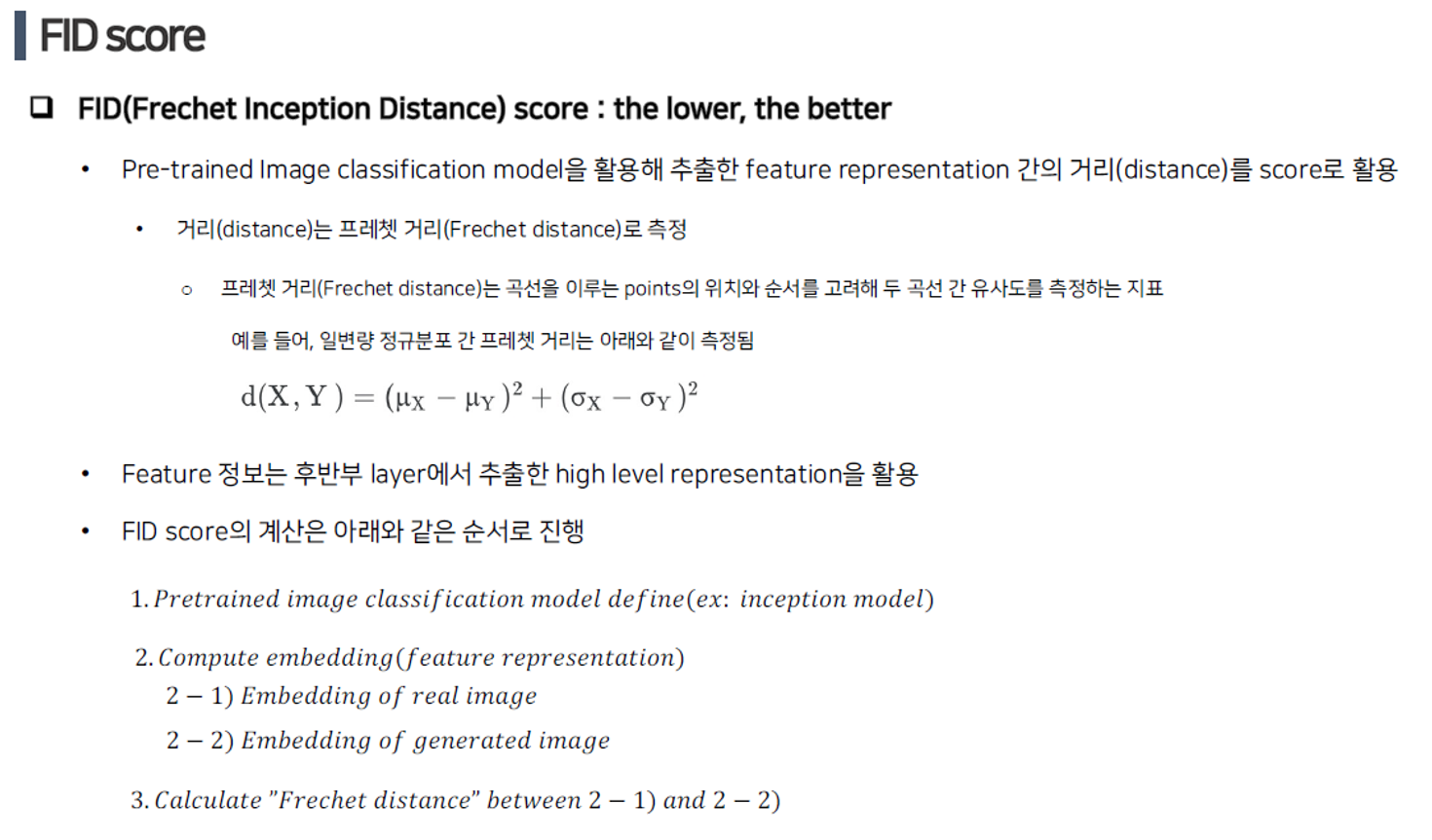 성능 측정 지표로 IS, FID score를 사용한다. FID score는 낮을수록 높은 성능을 의미한다.