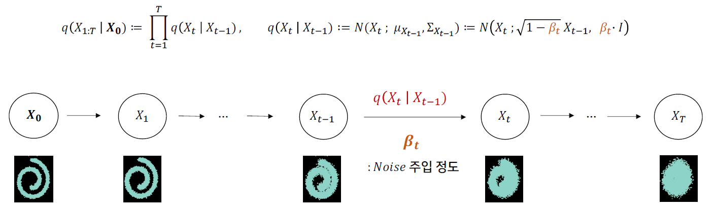 - markov chain으로 data에 점전적으로 noise를 추가하는 과정이다.