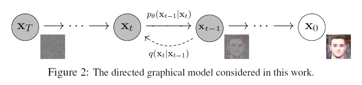 Gaussian noise를 제거해가며 특정한 패턴을 만들어가는 과정이다. \[p_\theta\left(X_{0: T}\right):=p\left(X_T\right) \prod_{t=1}^T q\left(X_{t-1} \mid X_t\right), \quad p_\theta\left(X_{t-1} \mid X_t\right):=N\left(X_{t-1} ; {\left.\mu_\theta\left(X_t, t\right), \Sigma_\theta\left(X_t, t\right)\right)}\right.\]
