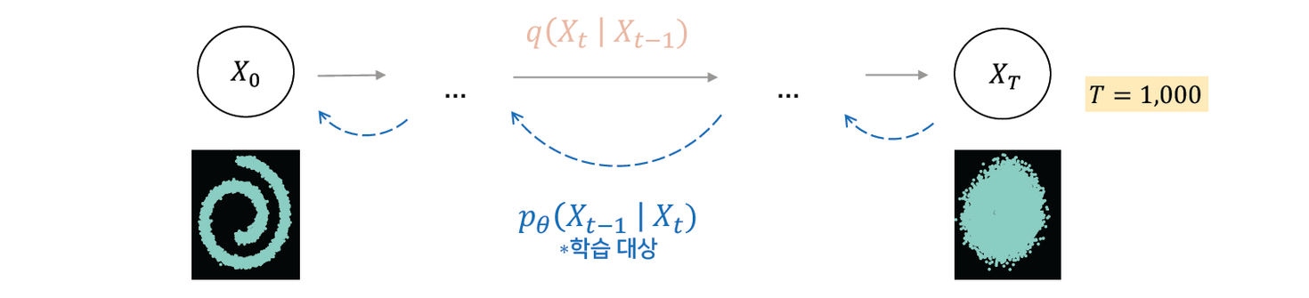 Diffusion process의 역 과정을 학습한다.