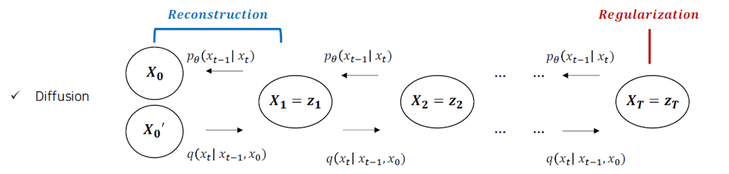 Regularization과 Reconstruction의 구조는 동일하게 가지고 있다. Diffusion은 Denoising Process를 가지고 있다는 것이 차이점이다.