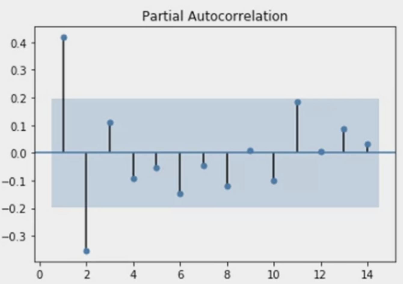 시차(lag) p값은 p+1시점과 그 이후의 시점의 값들에 영향을 미치지 않는 값을 선택해야 합니다. 위의 그림에서는 시점 3부터 유의미한 값이 아니라고 나오기 때문에, p값은 2로 설정할 수 있습니다.
