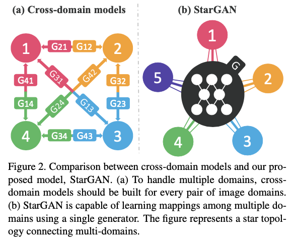 => StarGAN: 하나의 모델로 여러 도메인 간의 관계를 학습한다.