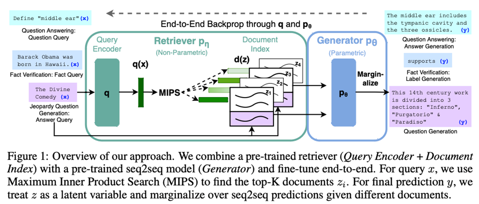 Pre-trained parametric memory + non-parametric memory 를 결합한 RAG 모델 제안 Parametric: pretrained seq2seq model Non-parametric: Wikipedia의 dense vector index