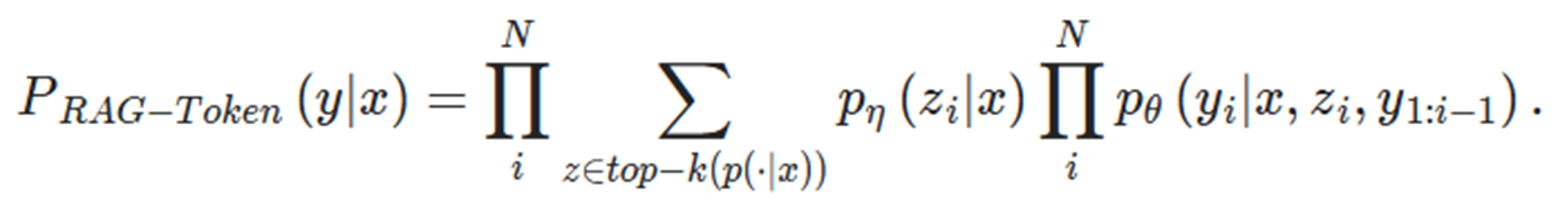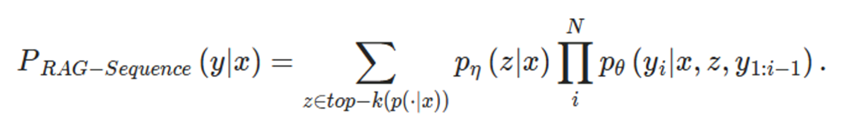 Generator: p세타 input: seq x(original query), z(검색된 passage), y_1:i-1(previous tokens) output: target seq y