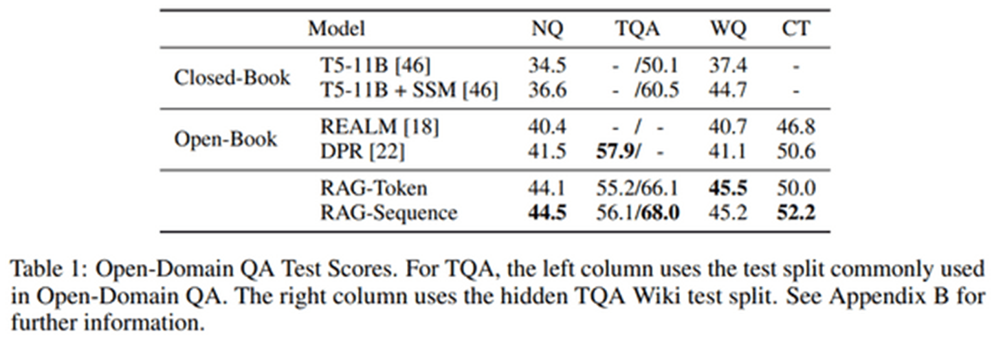 ODQA 하나 빼고 sota closed-book: 외부 데이터를 사용하지 않았다 - 기존의 사전학습으로만 진행되는 LLM open-book: 외부 데이터를 썼다 - 기존의 retrieval LM open-book 모델들과 RAG 비교하면 됨