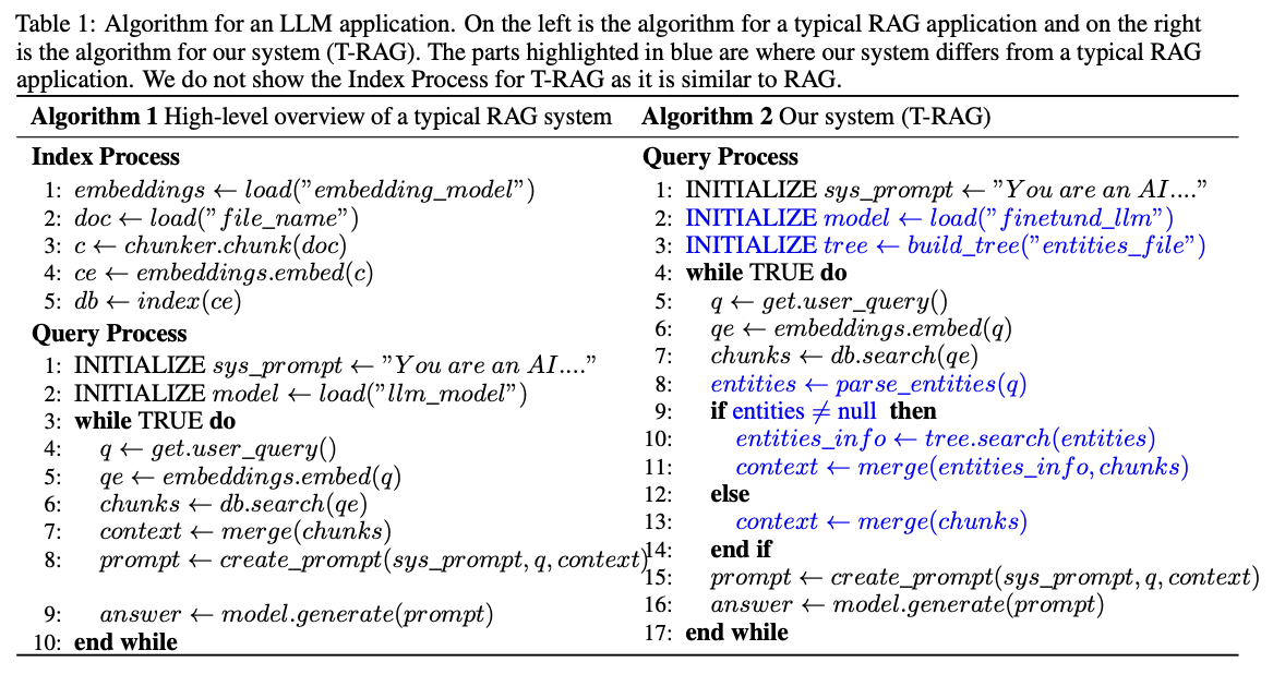 검색 과정에서, T-RAG는 벡터 데이터베이스에서 검색된 컨텍스트를 추가적으로 보강하기 위해 엔터티 트리를 사용