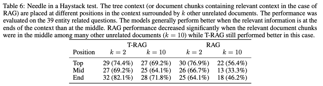 RAG 보다 T-RAG의 성능이 안정적임: 컨텍스트 위치나 크기의 영향을 덜 받는다.