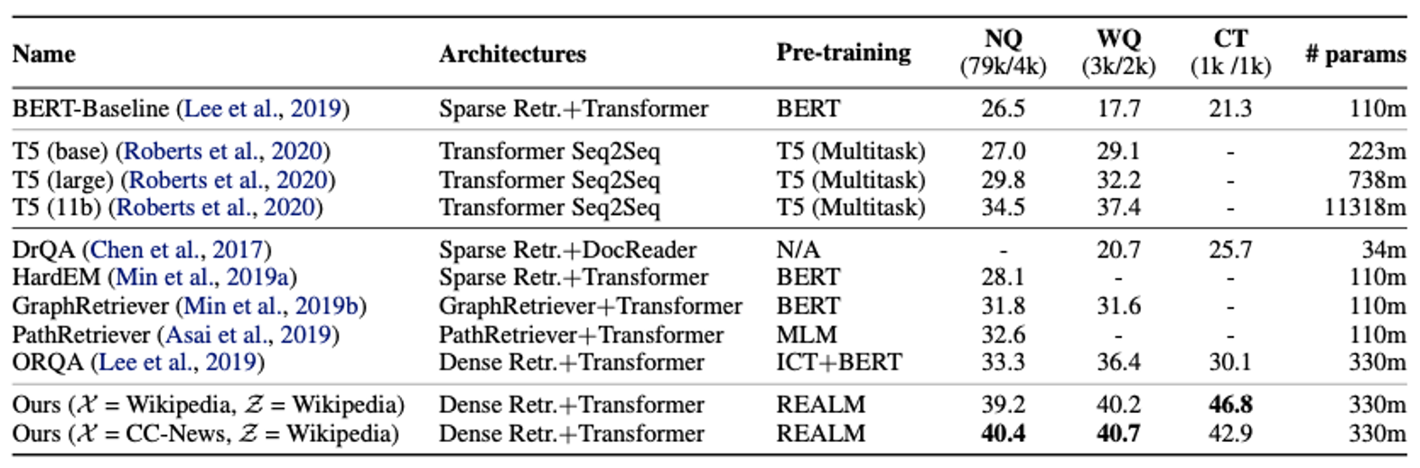 T5는 REALM과 달리 사전학습에서 SQuAD의 추가 MRC dataset에 접근한다는 점을 유의