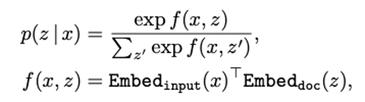 - 입력 x가 주어지면 지식 코퍼스 Z에서 관련 문서 z를 검색