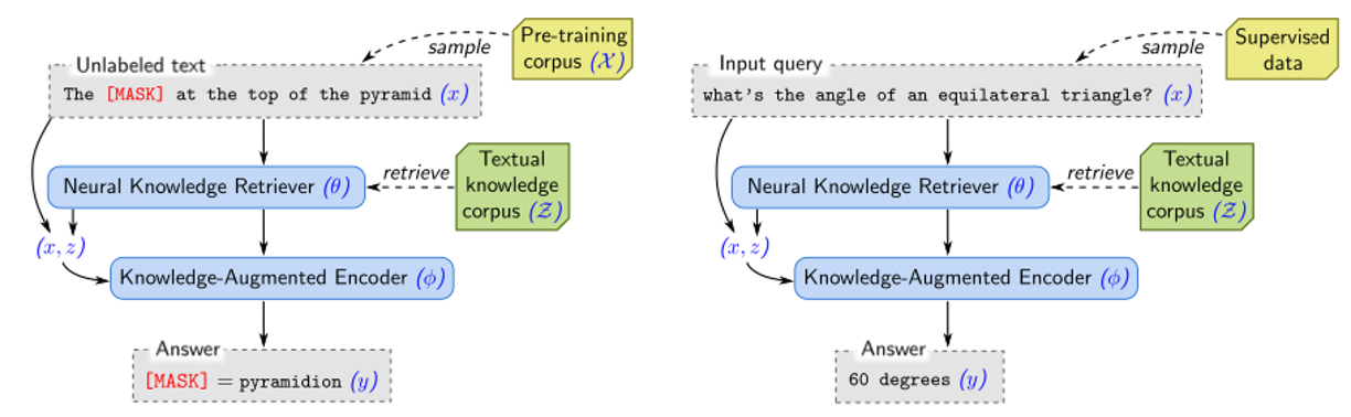 비지도 학습 방식으로는 처음으로 사전 학습하는 방법을 제시: MLM, retrieval step을 역전파 학습