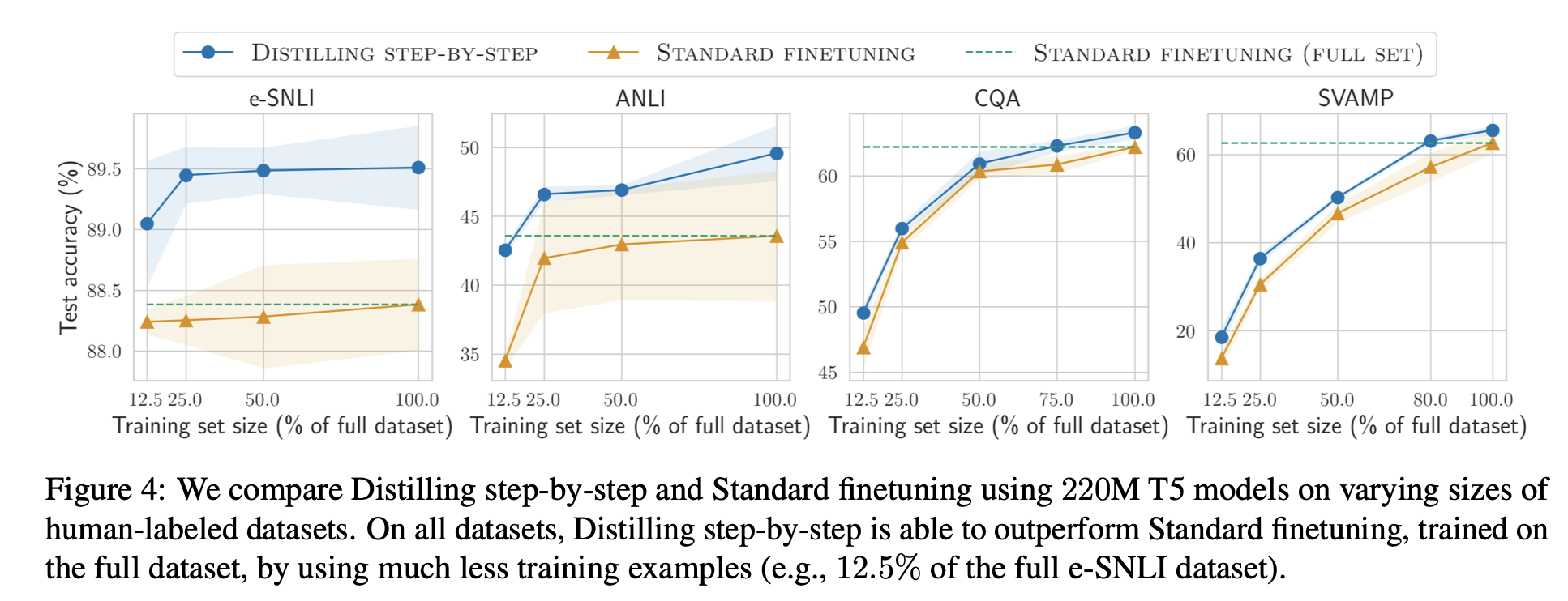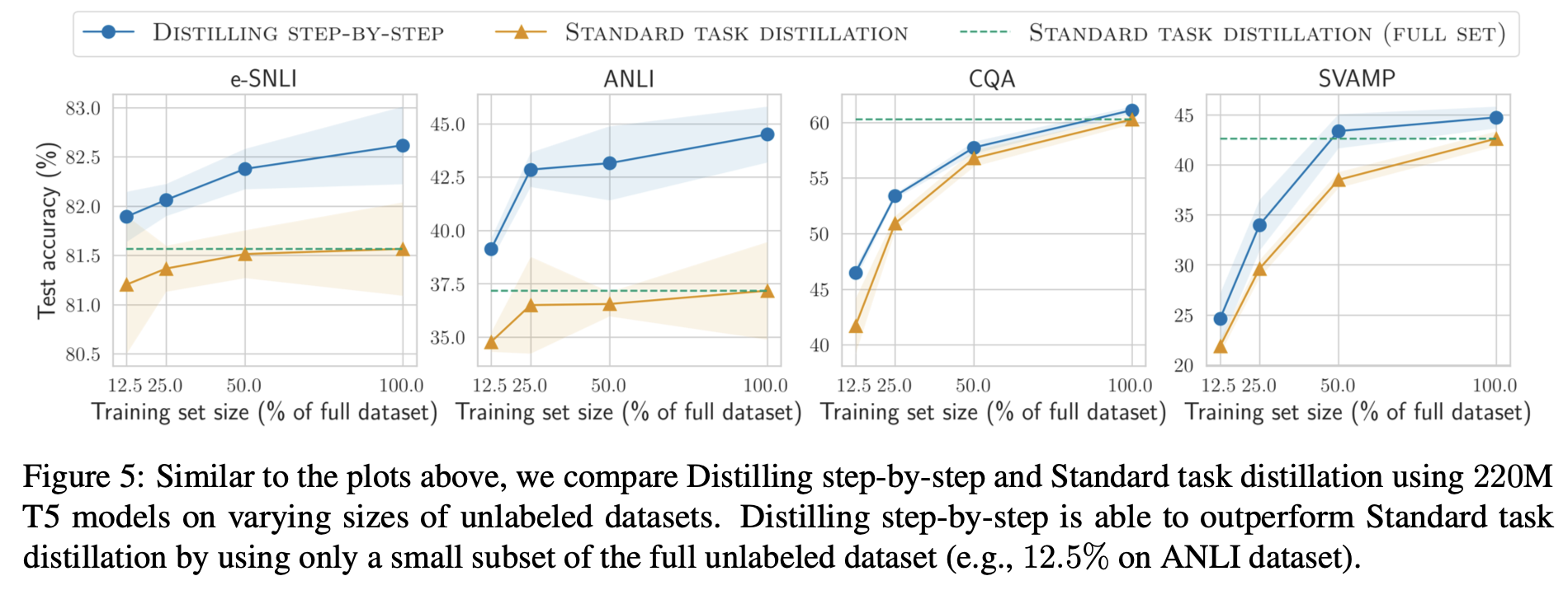 - Distilling step-by-step 방식은 훨씬 적은 학습 데이터를 사용하면서도 standard task distillation을 능가함