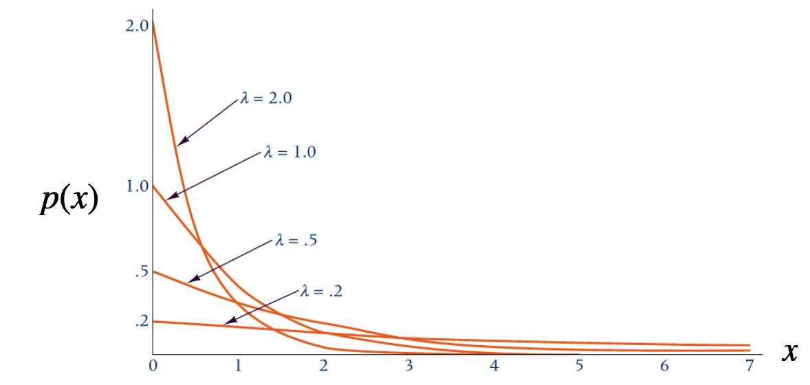 - CDF: \(P\left(x \geq x_0\right)=e^{-\lambda x_0}\)