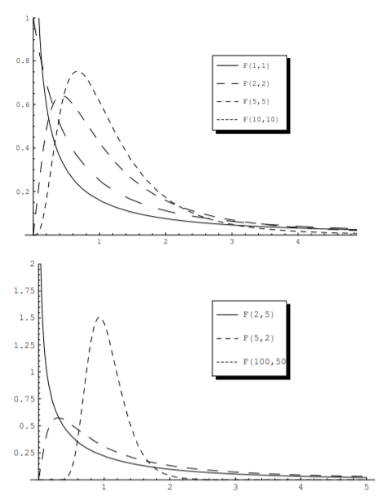 - 자유도(m, n)에 의해 형태가 결정됩니다. 두 확률분포의 분산 비율에 대한 분포이기 때문에 각 분포의 자유도 두 개가 parameter가 됩니다. (*m과 n의 순서를 고려해야 합니다.)