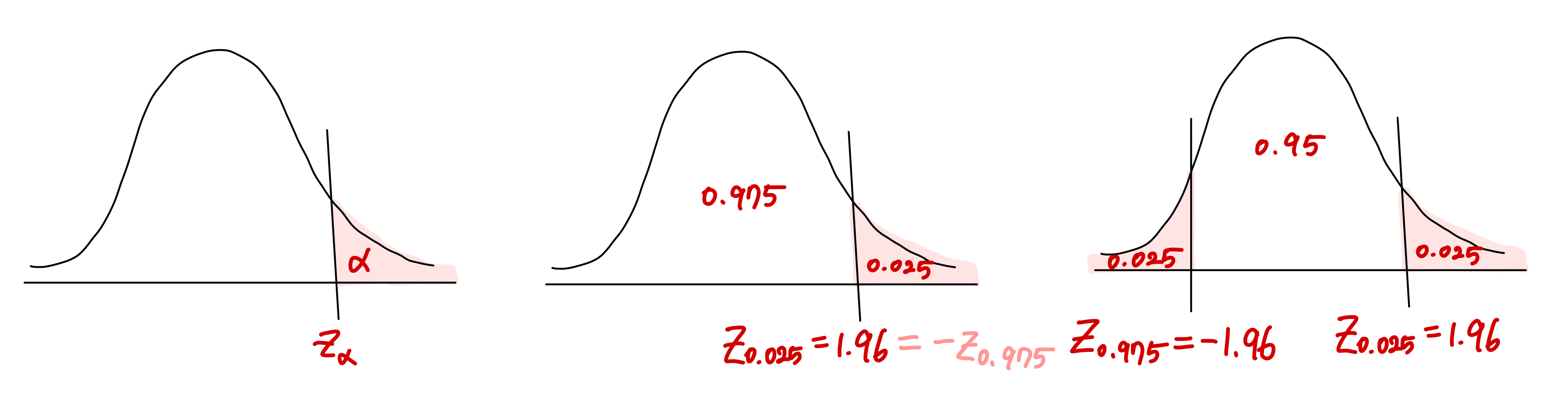 우리는 분위수(Quantile)를 이용해 표준정규분포의 특정 영역의 넓이(전체 넓이는 1)와 이에 해당되는 z score를 구할 수 있습니다. 자주 쓰이는 분위값은 아래와 같습니다. \[z_{0.025}=1.96, z_{0.95}=-z_{0.05}=-1.645, z_{0.975}=-z_{0.025}=-1.96\]