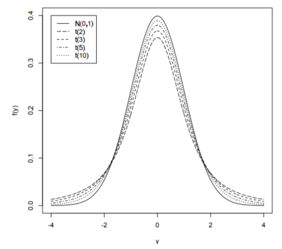 정규분포에서 좀 더 두꺼운 꼬리를 가진 형태입니다. uncertain values를 다룰 때 정규분포보다 더 적합하다고 합니다. 표본평균을 이용해 정규분포의 평균을 해석할 때 많이 사용됩니다.