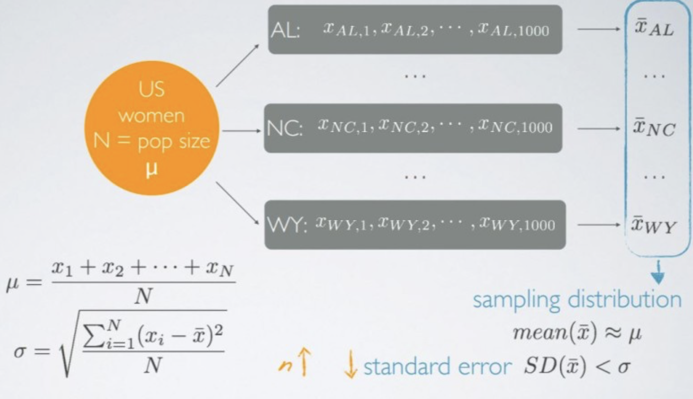 정리하자면, pop mean : \(\mu\) pop var : \(\sigma^2=E[(X-E(X))^2]=E(X^2)-E(X)^2\) sample mean : \(\bar x=\frac{1}{n} \sum_{i=1}^n x_i\) sample var : \(s^2=\frac{1}{n-1} \sum_{i=1}^n\left(x_i-\bar{x}\right)^2\) 표본평균의 평균 : \(E(\bar X)=\mu\) 표본평균의 분산: \(Var(\bar X)=\frac {\sigma^2}{n}\)