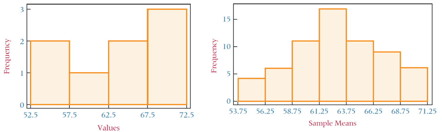 표본평균의 평균: \(\mu_{\bar{x}}=\mu\) 표본평균의 표준편차: \(\sigma_{\bar{x}}=\frac{\sigma}{\sqrt{n}}\)