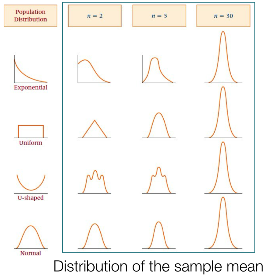 - 모집단의 분포와 상관없이, 표본평균의 분포가 정규분포를 근사함.