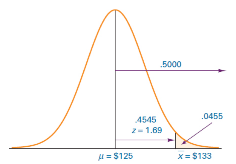 풀이 \(P(\bar X \geq 133)=P(z \geq \frac{133-125}{30/\sqrt{40}})\approx 1.69\) z분포표에 따르면, z=1.69의 확률은 0.4545