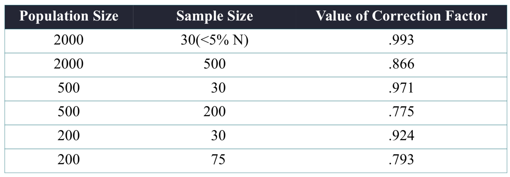 지금까지는 모집단이 무한대이거나 충분히 클 때를 가정했음. 모집단이 유한하고 표본을 비복원추출할 경우, \(z=\frac{\bar{x}-\mu}{\frac{\sigma}{\sqrt{n}} \sqrt{\frac{N-n}{N-1}}}\) N은 모집단의 크기, n은 표본의 크기