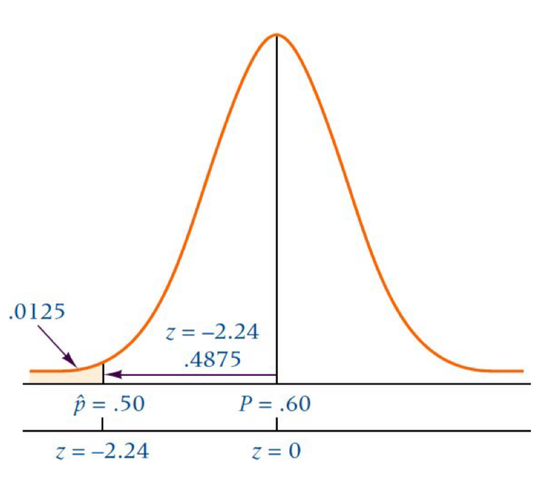 \(z=\frac{\hat{p}-p}{\sqrt{p q / n}}\) \(z=\frac{0.5-0.6}{\sqrt{(0.6 \times 0.4) / 120}} \approx -2.24\)